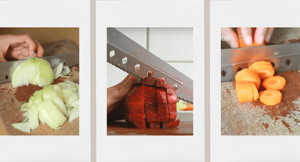 - 甜菜根切丁(不必太小)、洋蔥輕鬆切幾塊、紅蘿蔔少許切片(我不希望它太大顆搶走別的食材風味)