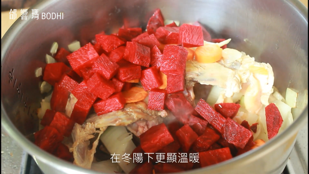 - 雞架骨下鍋,上色後洋蔥下鍋,等到洋蔥有點轉透明(不用全透!),加入甜菜根與紅蘿蔔,稍微翻炒去除土味